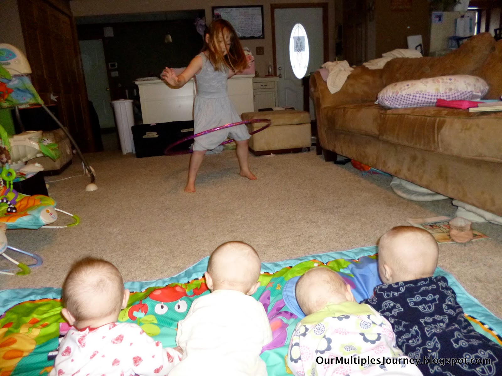 Another by-product of sick babies? Disrupted sleep. They have been sleeping wonderfully through the night for over 4 months now, but this last week at least one person was up at least once over night (Jenna included). We certainly have lived on sleep deprivation before, but when you're not us to it it is hard! Normally if a baby fusses (a lot) at night, we calm them, change a diaper if necessary, rock them a few minutes, and then put them back in the crib. This (normally) works great. But with them sick, we have totally inconsolable babies & all that went out the window... this morning Andy & I had all four in our room by sunrise! Not normal. Like, ever. We do have 2 rock-n-plays in our closet we can place a baby in if really fussy overnight, but this morning we ended up with that plus an additional 2 in our bed! It was truly an "oh my goodness we have 4 sick babies" moment. I think I even muttered that to Andy as he got #4...